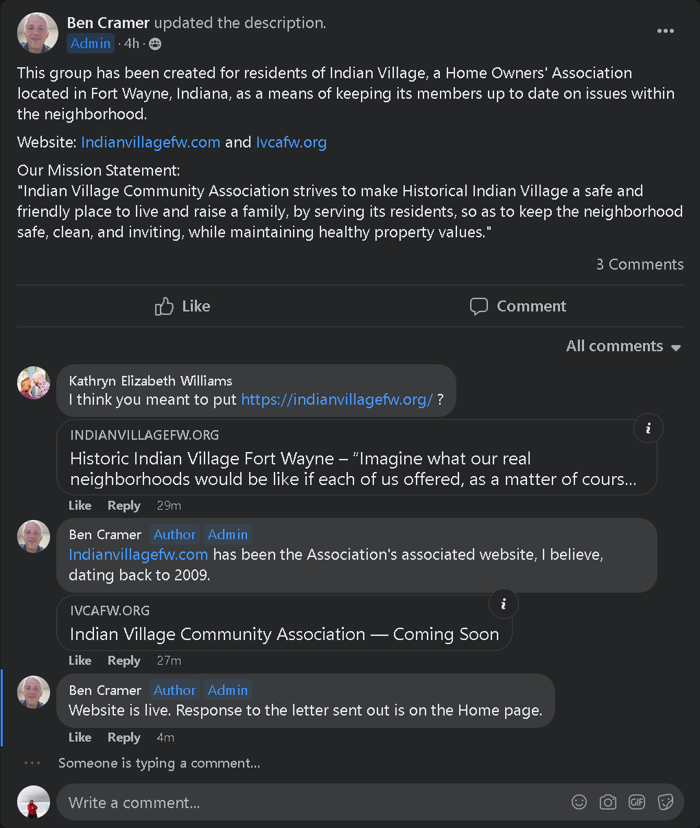 | 8 | Screenshot 2022-04-07 at 09-59-52 Indian Village Community Association Facebook.png | 128k | 1053.3 days | 86ce46c7a4b368307da772534d0a38888ae0cb8e | |
